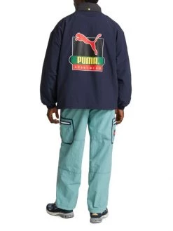 Puma and AMI paired up to create an easy-going, lax collection of oversized, boxy silhouettes. Combining the Bavarian sportswear brand’s casual style with the Parisian label’s tailoring, this collaboration harnesses their respective amicable reputations and builds upon their followings. The line includes striped polos, crewneck sweaters, and pleated sweatpants, complete with a newly created co-branded logo. This sweater features a co-branded motif at the chest.