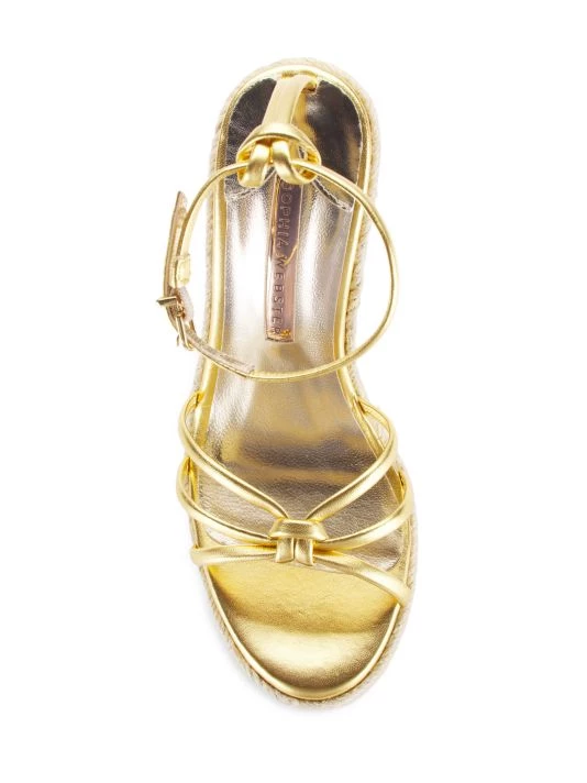 These metallic leather wedges feature a caged, knotted upper with a crystal-embellished jute midsole.