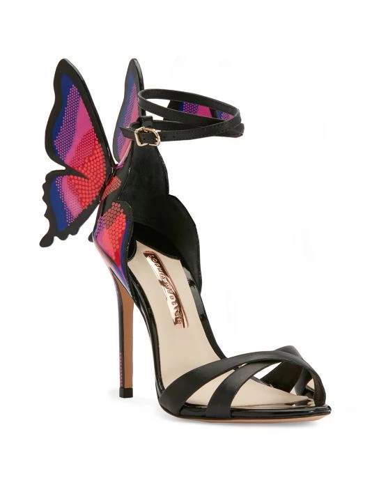 Sophia Webster’s Chiara sandals are crafted of smooth leather with a crisscross vamp and ankle strap. These heels boast a multicolored butterfly applique.