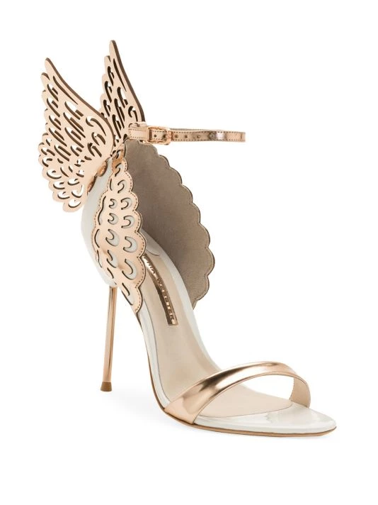 Fantasy-worthy heels marked by icy metallic leather wings and straps.