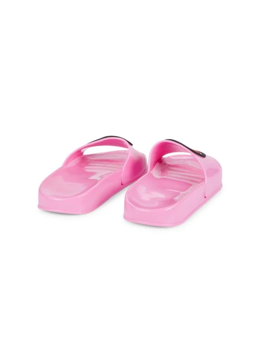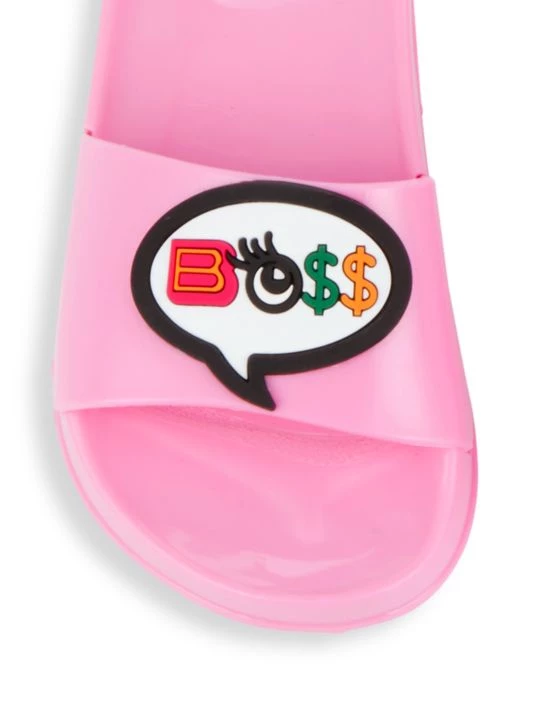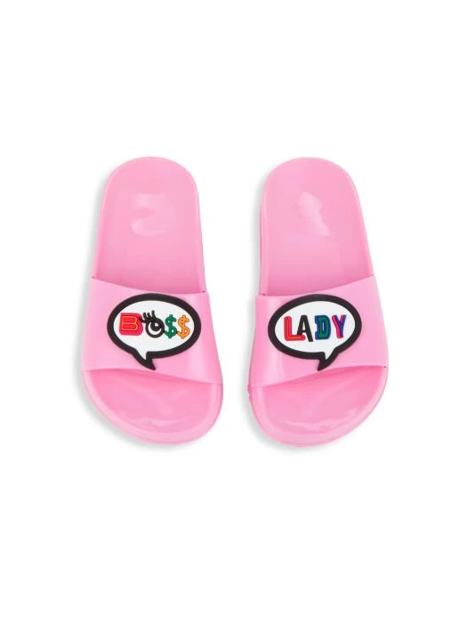 Cute and splashy, these slip-on pool slides feature “Boss Lady” word bubble appliqués..